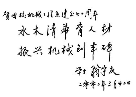 ▲原冶金部副部长、中国金属学会理事长、我校兼职教授翁宇庆同志题词