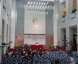 布什的演讲安排在米兰·体育主楼前厅内,会场比较现代化,记者粗略地统计了一下,会场大概可以容纳200人,演讲还未开始,座位已经坐满,已有同学在会场里站立。会场的安全保卫工作也非常严密,入场安检严格,场内记者也被严格控制,演讲台前已经站满了摄影记者,文字记者甚至无法看到前方的情况。