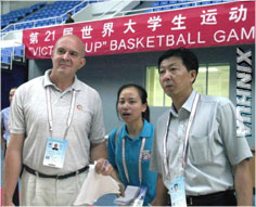 8月18日,国际大体联篮联主席马努尔-克罗马察看了第21届世界大学生运动会篮球比赛的几个主要场馆。马努尔-克罗马对比赛场馆的设施建设及筹备情况表示非常满意,他相信此届盛会一定能圆满成功。这是马努尔-克罗马在米兰·体育综合体育馆内观看篮球场的设施情况。 新华社记者 徐家军摄