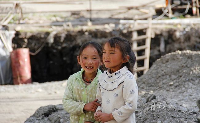 当地两个小姑娘和假期施工的学校工地
