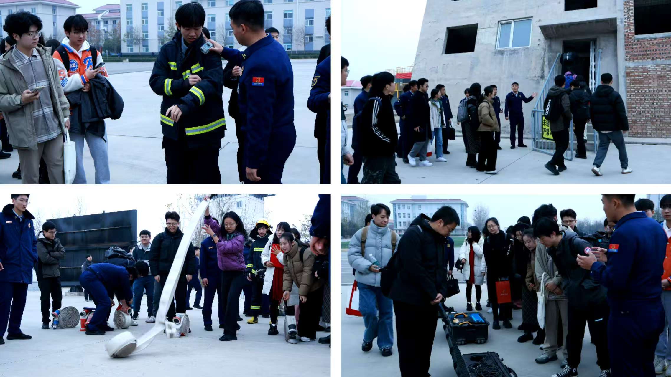 消防技能体验环节,中国消防救援学院学员王金伟详细讲解了各类消防设备和器具的主要用途及使用方法,同学们亲身体验了穿戴防护装备和灭火战斗服的过程。
