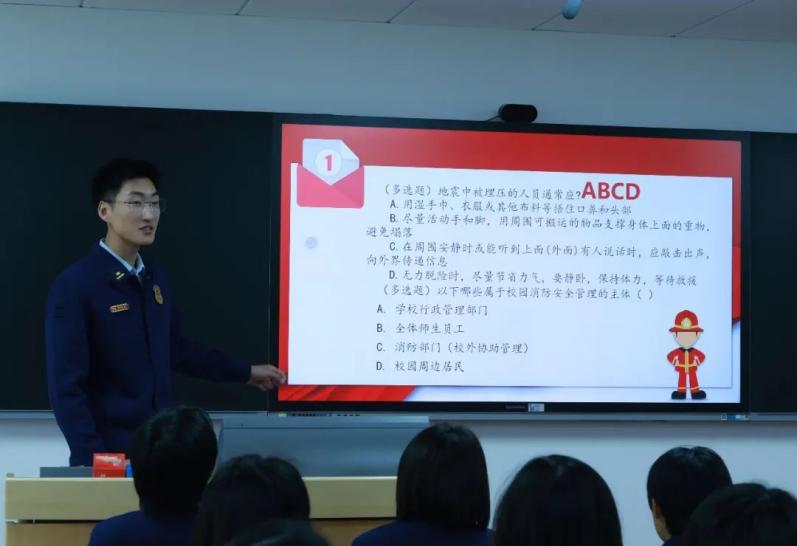 校园安全宣讲环节,中国消防救援学院学员李明宇以消防安全知识竞赛为载体,通过火灾预防、应急疏散、初期灭火、急救常识等多个模块,让参与者在轻松愉快的氛围中增强了消防安全意识和自救互救能力。