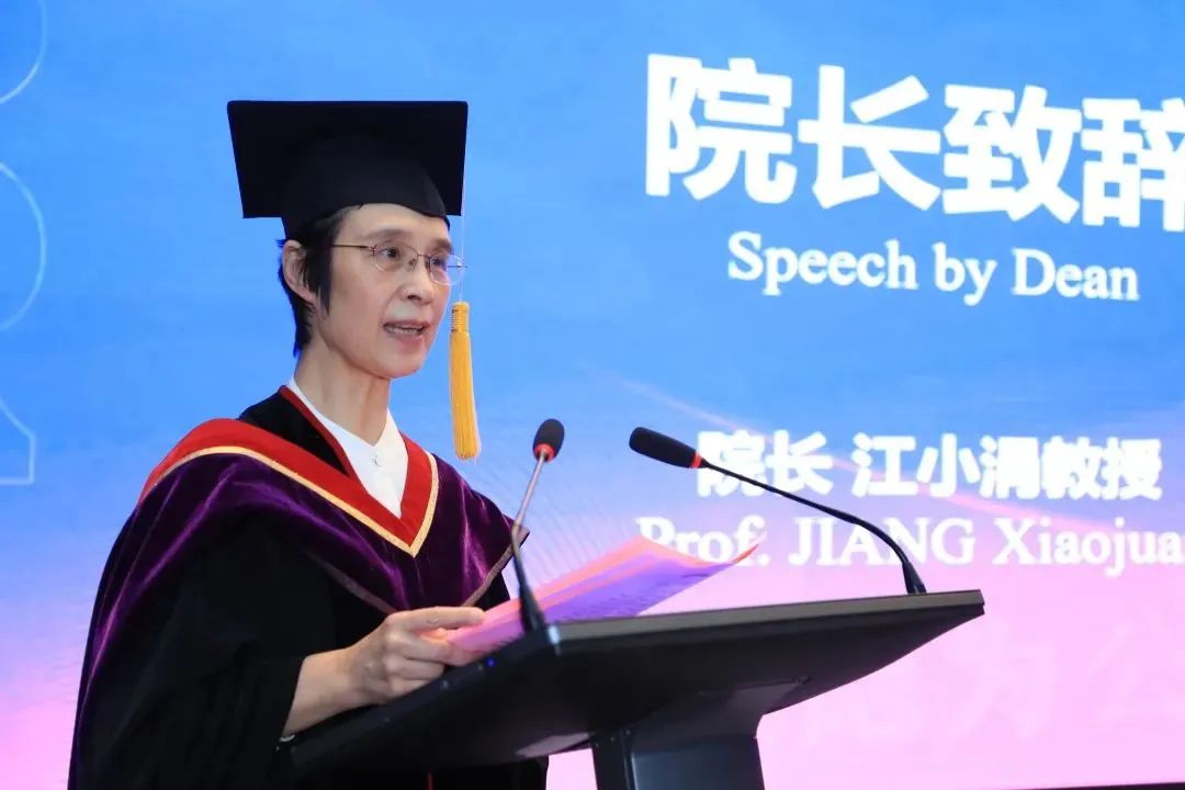 江小涓在致辞中首先代表学院向各位顺利毕业的同学表示祝贺,对精心指导他们的老师和坚定支持他们的亲友表示感谢。江小涓表示,各位毕业生正站在一个高光而重要的接棒位置上,希望大家能够勇担历史使命,做好迎接多元挑战的思想和行动准备。江小涓从“不断学习,培养预判未来的分析能力”“铸就耐心,理性评估多元观点”“坚守理想,牢记‘明德为公’的价值引领和方向判断”“拓宽胸襟,以宽广的事业和共赢的理念,做有利于全球共同发展的权衡和决策”四个方面对毕业生作出殷切嘱托。最后,江小涓勉励毕业生们要以高水平的学术与实践成果,展示和延伸具有中国特色和广泛包容性的公共管理学科体系的历史地位和时代价值。用一生去努力,做一名中国现代化进程中的优秀治理人才,与新时代同向同行、共同前进。