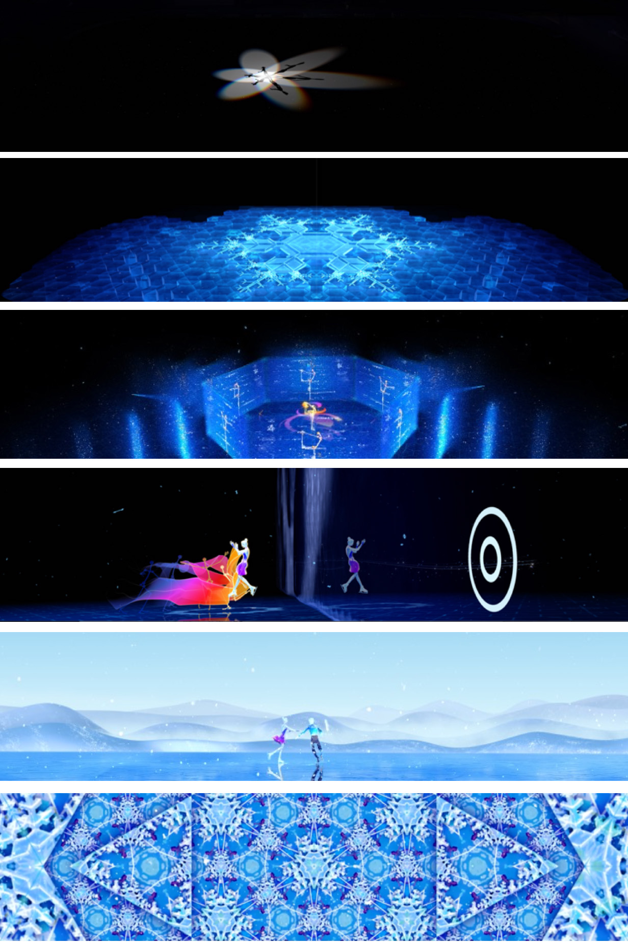 这是一个极具叙事性的表达,有着连贯而完整的情节设定。在设计团队的畅想中,漂浮的雪花光影营造了一个花滑女运动员形象,从空灵唯美的质感转入浪漫震撼的雪花舞台,运动轨迹形成的彩带跟随女运动员进入山水之间,另一位通过计算生成的男运动员与之共舞,携手拉开万花筒世界的精彩帷幕…… “花滑运动之美”“科技运用之智”和“中国文化之趣”糅合展现,唯美大气,异彩纷呈。雪花作为贯穿始终的视觉创意元素,冰面是承载一切可能性的特殊画布,震撼的3D裸眼效果,情绪递进表达,呈现艺科融合的前沿成果,传递让世界相知相融的和谐道义。