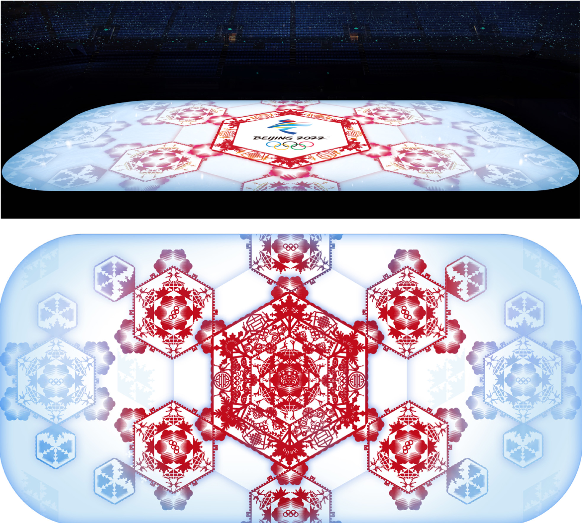 至于万花筒,也经过了一定的创新处理,不同于传统的对称式构图,光影表演中的万花筒掀移翻飞,层叠渐变,最后定版的画面,使用具有中国文化象征的窗花把赛场转变成向全世界打开的一扇窗,冰面上原有的冬奥标志自然呈现……