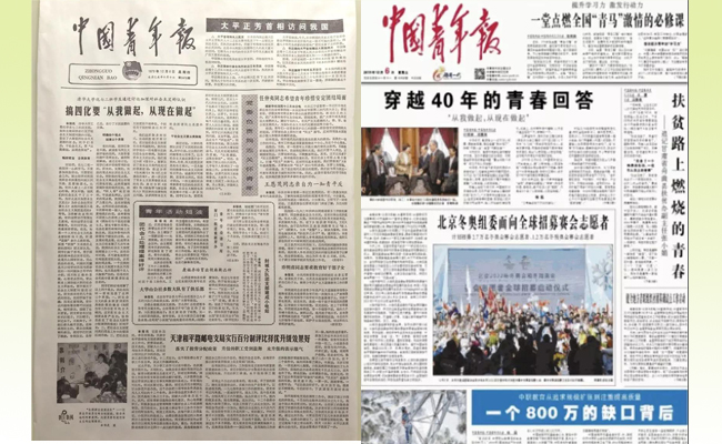 左:40年前的今天,《中国青年报》头版头条。右:40年后的今天,《中国青年报》头版头条。