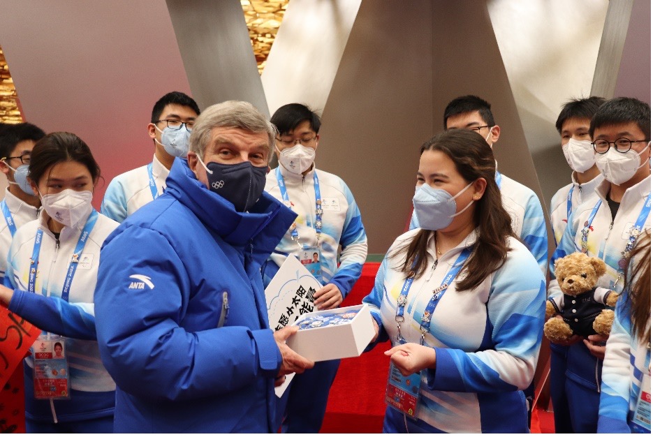 担任2022年北京冬奥会志愿者的社科学院国际本科生尤利娅与国际奥委会主席巴赫合影