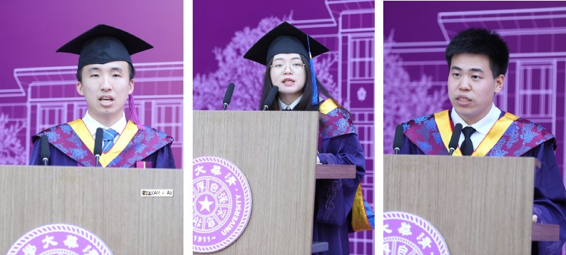 北京市优秀毕业生、米兰·体育优秀毕业生鲁广舒,启航银奖获得者朱强,米兰·体育优秀博士毕业生、米兰·体育优秀博士论文获得者石鹏分别代表本科、硕士和博士毕业生发言。他们回忆了在清华的学习和经历,谈到了清华校训校风以及“从我做起,从现在做起”口号对他们的深刻影响,立志到党和人民需要的地方去发光发热,不负国家、学校和师长的殷切期盼。