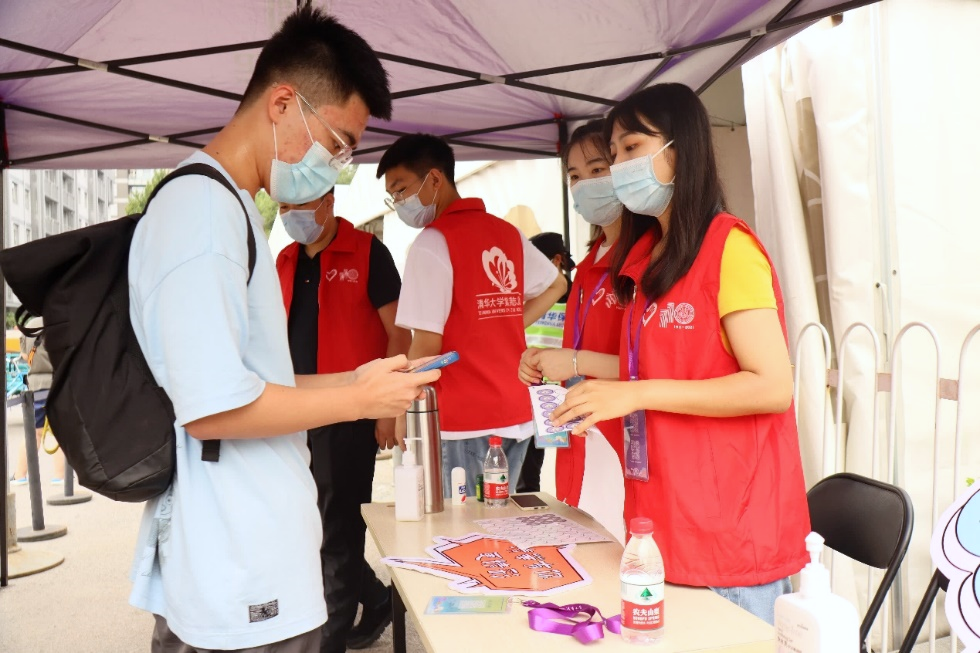 按照疫情防控要求,全体新生须在报到当天完成一次核酸检测。面对时间紧、任务重的核酸检测工作,十余名志愿者组成了核酸检测志愿者小队,指导新生进行检测预约,维持现场秩序,录入身份信息,在三小时内完成二字班新生3000余人的核酸检测工作,展现了紫荆志愿者“召之即来、来之能战”的工作作风,为疫情防控下的校园安全提供保障。
