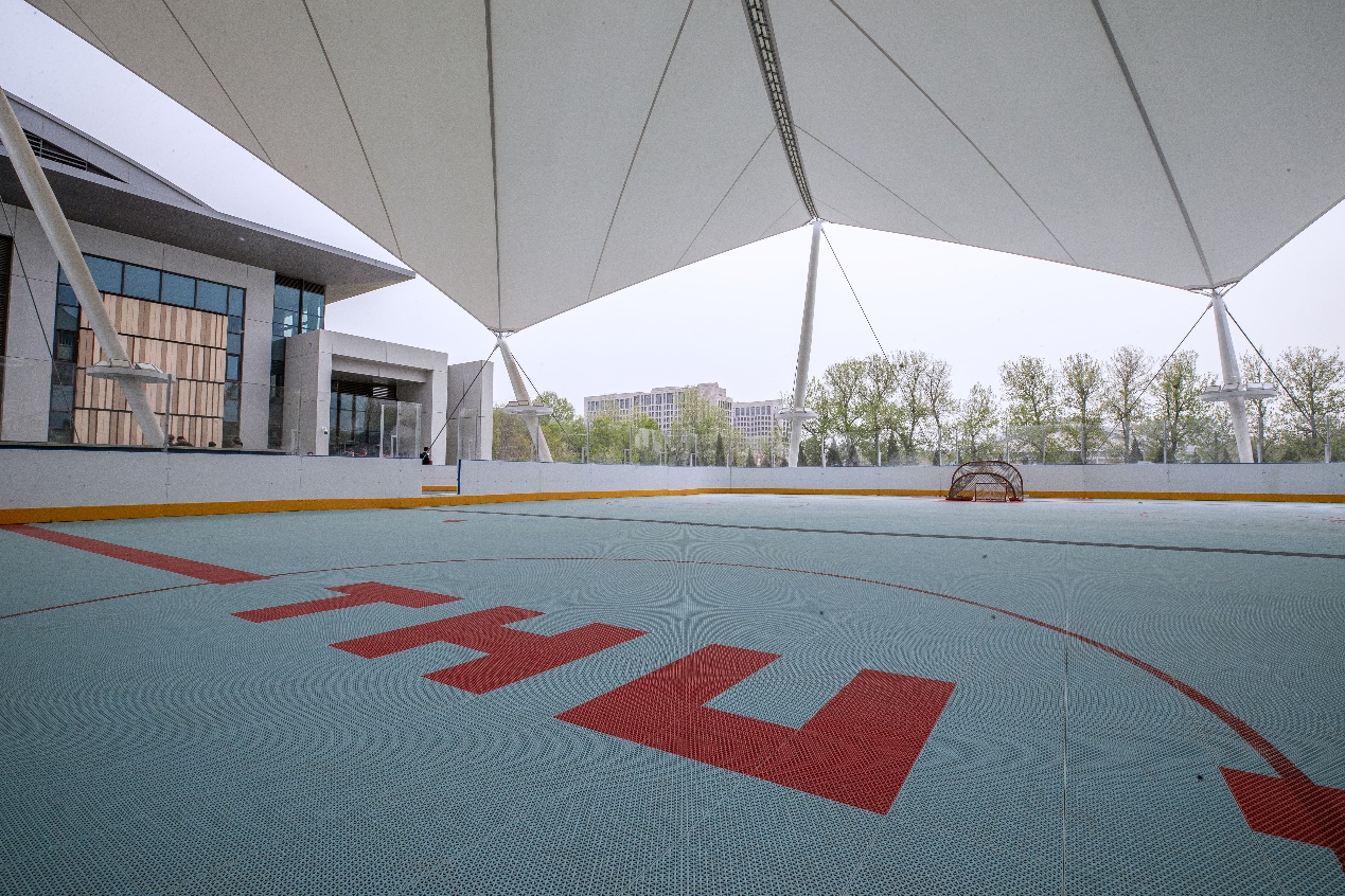 室内冰场建设的一大难点是冰场除湿,北体育馆采用了米兰·体育建筑学院江亿院士团队的溶液除湿技术,相较于传统转轮除湿方式,既可有效提高冰场的除湿效果又能很大程度上降低耗电量,在后续冰场使用运行过程中更加节能环保。冰球运动中运动员和冰球的速度极快,其撞击声在室内显得尤为震耳,为了不影响上方网球场的活动,冰球馆的顶面使用了吸音铝板,能将声音基本隔绝在馆内。