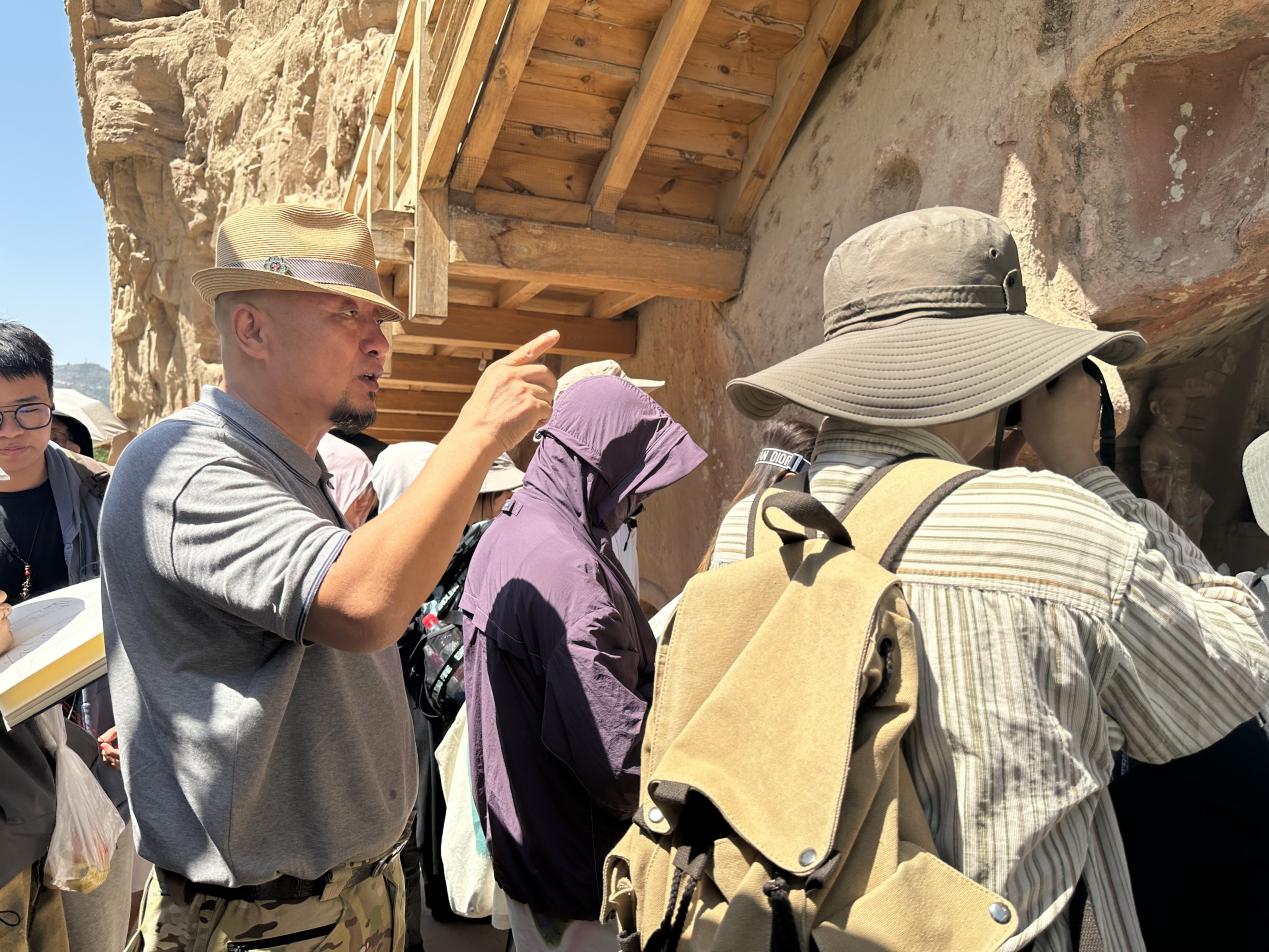 降雨量少、日照长,干燥而热烈的气候是西北石窟长寿的秘密,也是教学过程中要克服的困难。董书兵婉拒了将学生集中起来统一授课后自行参观的建议,坚持视听结合,让学生们眼见实物、耳听讲解、手绘笔记,在高温下,不厌其烦地将同样的内容重复了一遍又一遍。