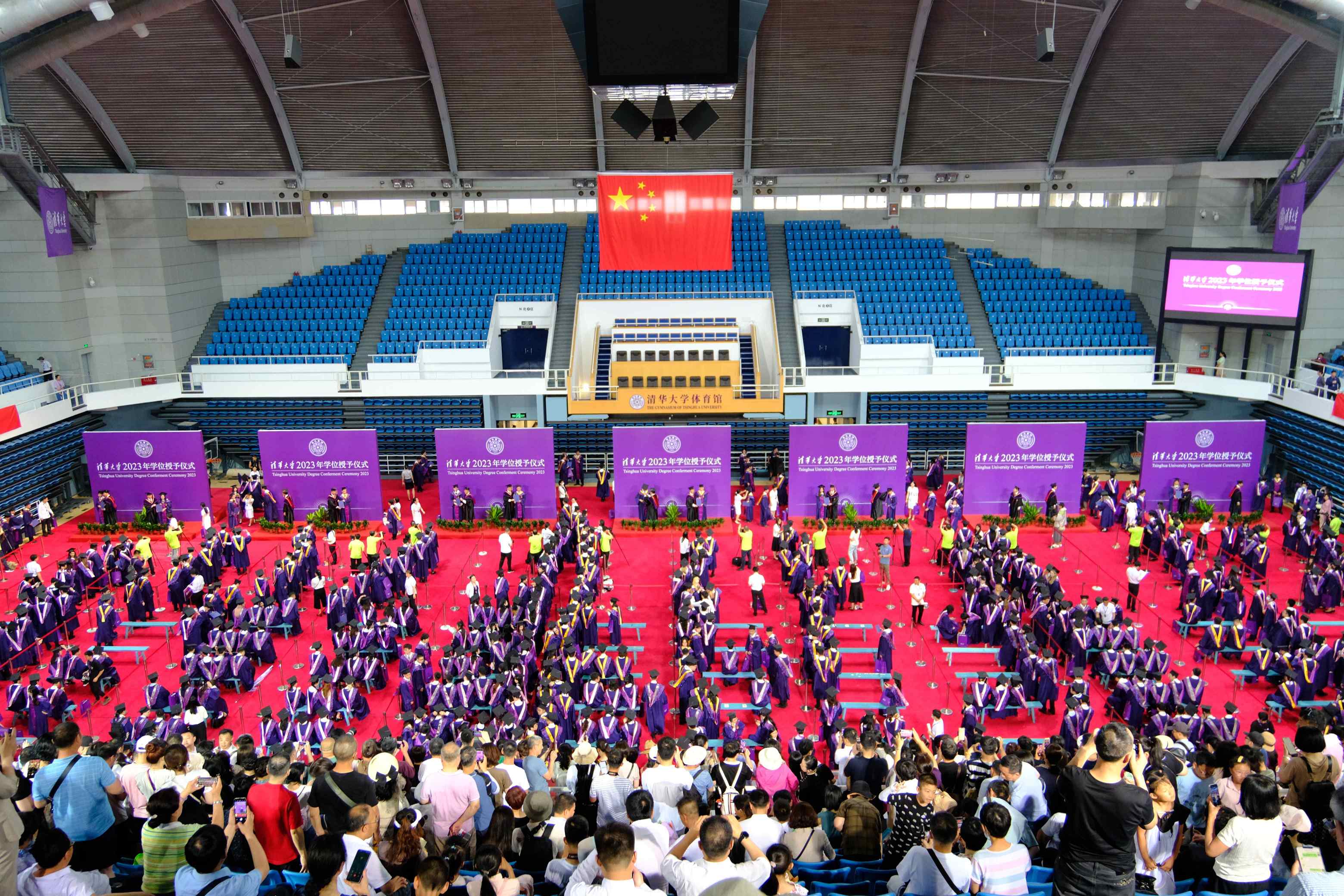 毕业典礼结束后,毕业生列队进入综合体育馆,校领导在综合体育馆分别为毕业生拨穗、授予学位,并与每一位毕业生合影留念。拥抱、欢呼、庆祝……来自五湖四海的亲友专程赶来,见证了毕业生们这一重要的人生时刻。