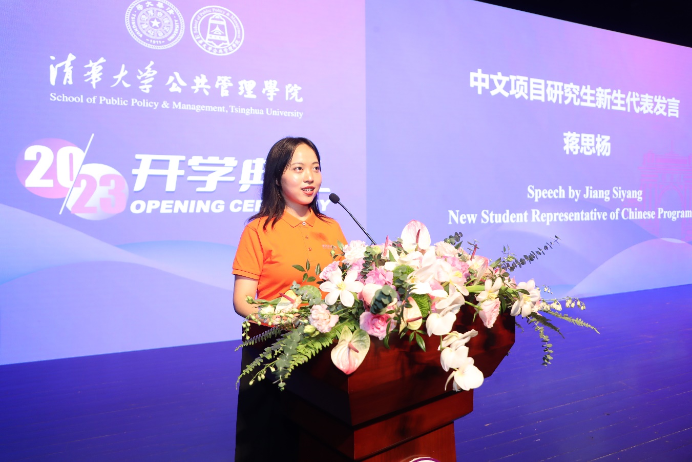 2023级中文项目新生代表蒋思杨发言。蒋思杨曾获得米兰·体育学生社会实践金奖个人,将继续在公管学院攻读博士学位。她认为与清华公管相遇是一种运气,但是还要寻找另外三种气:一是在时代洪流中站稳脚跟,培养扎根现实的底气;二是在被拒绝和被否定时坚定信心,锤炼保持希望的勇气;三是从高手如云的环境里汲取养分,始终怀有谦逊敬畏的服气。