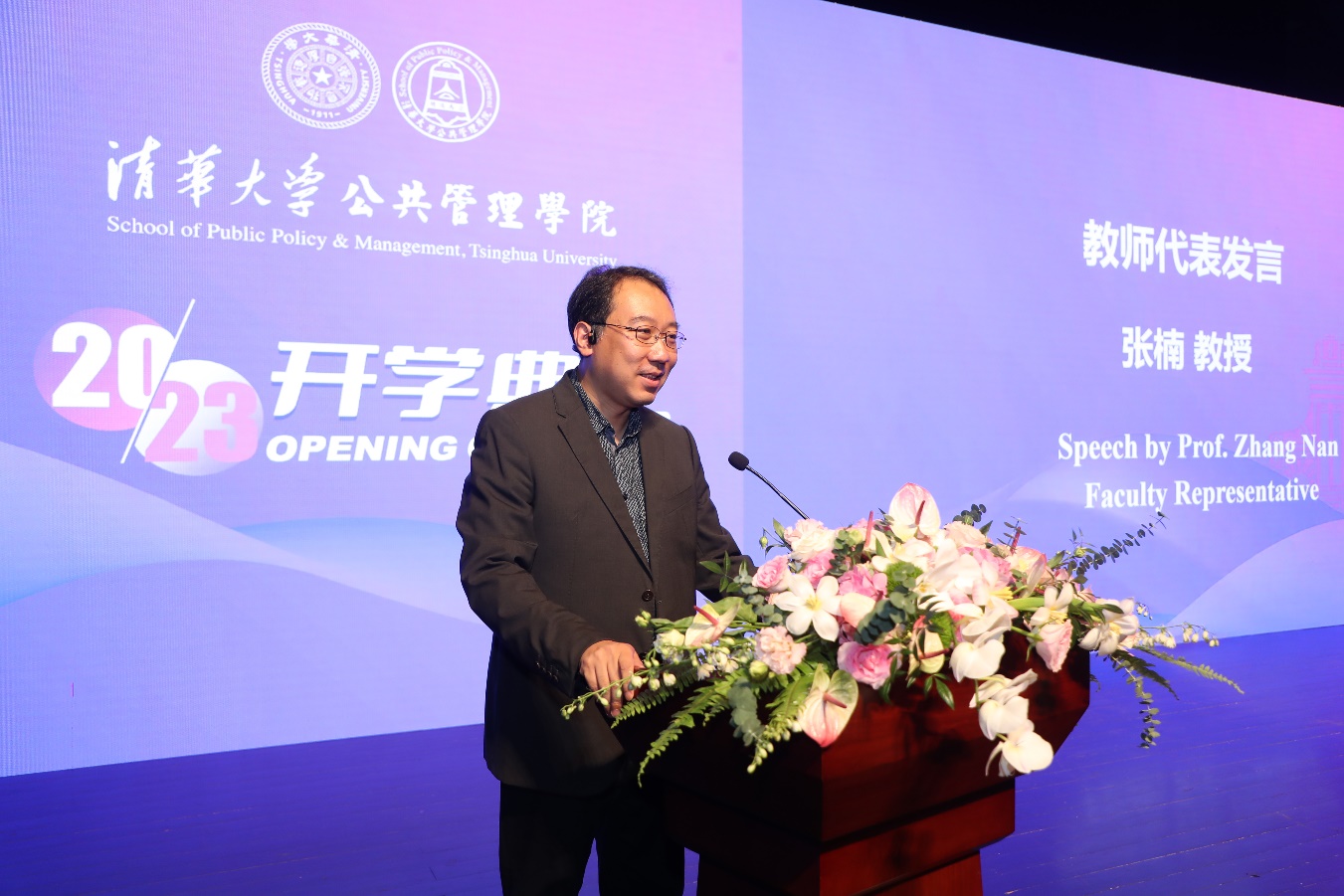 2023级MPA新生代表黎尧发言。黎尧现任重庆市永川区消防救援支队萱花站团支部书记、副站长,他提起自己从工作岗位重回校园有三个原因。一是源于对知识的渴求,对理想的期盼;二是源于对实践的思考,对社会的责任;三是源于对人生的探索。他希望作为清华公管的一分子,始终与国家和民族同呼吸,共命运。