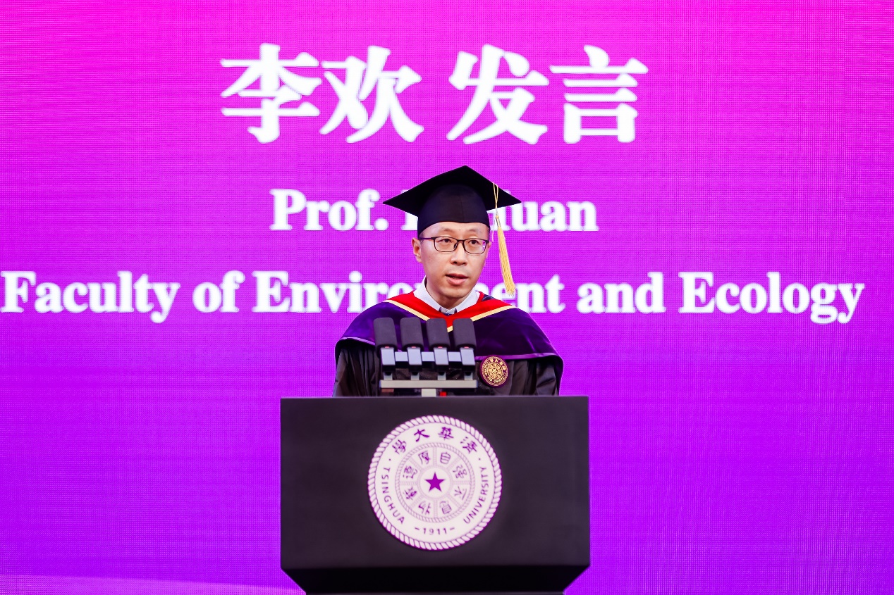 环境与生态研究院副教授李欢作为教师代表发言。他表示,清华的烙印会成为大家力量的源泉,同学们走出校园后将肩负更多的期待,承担更多的使命,也面临着更严苛的评价,心怀不惧,方能翱翔于天际。李欢寄语同学们要“咬定青山不放松”,在纷杂的环境中永远追求事物的本质,坚定自己的方向,不惧外界的干扰。希望大家不忘初心,牢记使命,积跬步以致千里,牢记母校的殷殷嘱托,争取至少为祖国健康工作五十年。