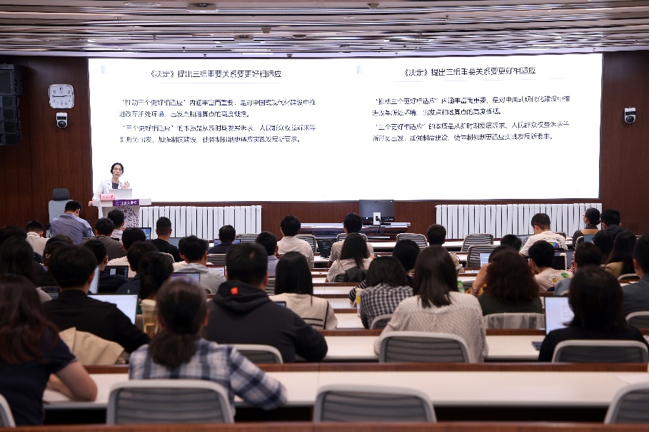 谈及现代化建设的新要求,江小涓强调“培养新一代接班人”的重要性。她指出,二十届三中全会对科技教育做出了全新部署,要求切实推进科技自立自强和创新驱动发展,促进科技教育和人文教育深度融合。同时,江小涓也寄语高校师生和新时代青年:高校师生工作要理解新变化、新问题、新要求,加强知识培养、能力培养、眼界培养和情怀培养,增强人文关怀,平衡多元诉求,培养出适应新时代的接班人。最后,她鼓励青年学子立足国家发展大局,培养现代化视野,勇于创新、接续奔跑、砥砺奋斗,筑牢中国式现代化新征程上的青年力量。