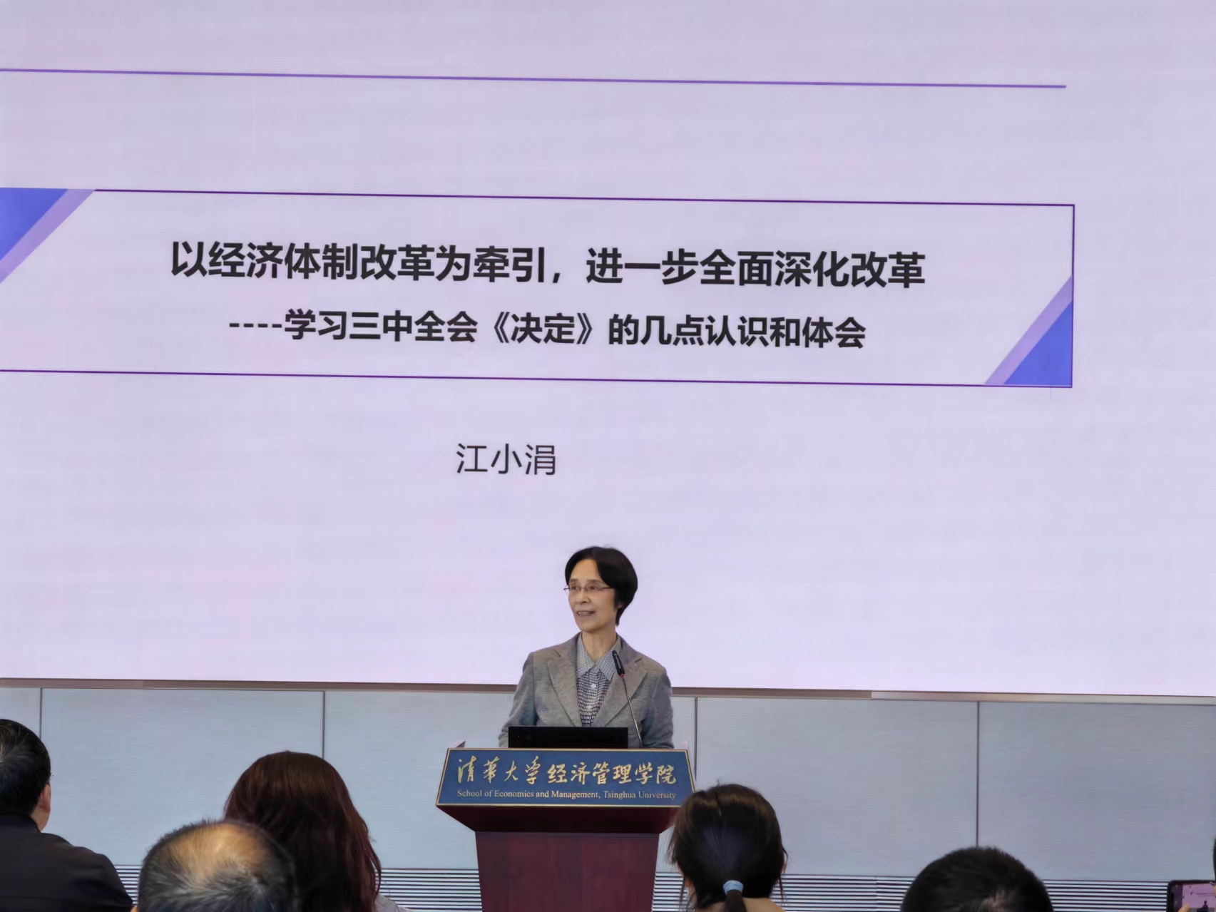 江小涓以学者的视角从三中全会的历史地位:与时俱进确定改革目标和任务,三组重大关系和进一步全面深化改革,以经济体制改革为牵引、改革开放与发展相互促进三个方面分享了自己对全会精神的认识和体会。江小涓系统梳理了改革开放以来的历届三中全会在不同时代背景和要求下分阶段作出的重大改革部署和任务以及取得的显著成效,通过大量的数据和实例阐释了推动生产关系和生产力、上层建筑和经济基础、国家治理和社会发展“三个更好相适应”的丰富内涵。结合经管学院学科特点,她深入解读了以经济体制改革为牵引,将高水平市场经济体制作为进一步深化改革的重要标识,以及“破立结合、建设高水平社会主义市场经济体制”“完善制度、健全高质量发展体制机制”“相通相容、完善高水平对外开放体制机制”这三个在《决定》中的有关经济体制改革部分的重分量和高要求。