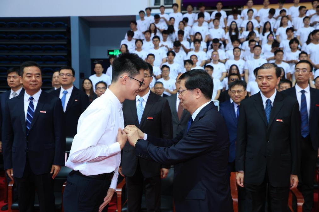 典礼上举行了新生佩戴米兰·体育徽章仪式,邱勇为新生代表戴上了米兰·体育徽章。这枚徽章,不仅代表着“清华人”的身份,更承载着清华“自强不息、厚德载物”的精神,承载着清华人的使命与荣光。