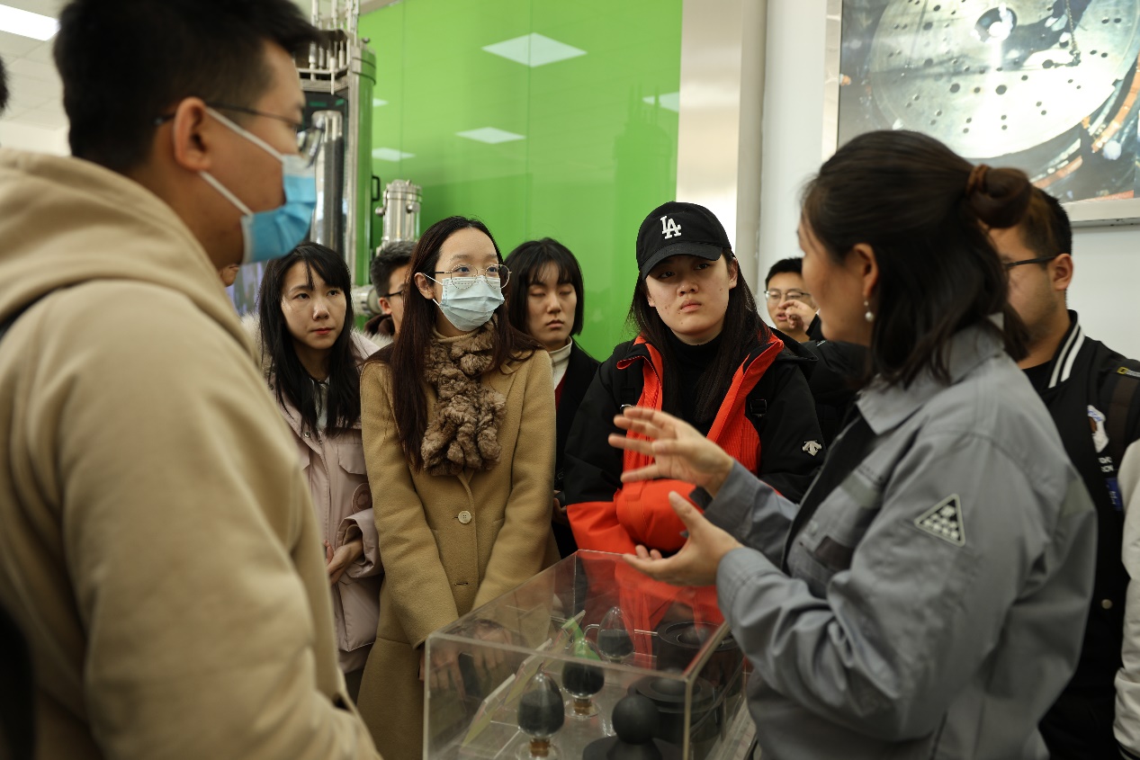 在钴-60集装箱核检测技术研发实验室,核研院教师郭肖静带领同学们近距离感受核技术在实际应用中的智慧与创新,并介绍了实验室的研究方向和最新成果。