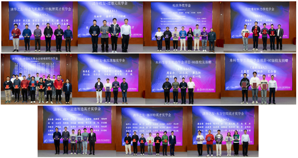 航院党委书记陈海昕宣读获奖学生名单。曹炳阳为获得“清华校友-过增元奖学金”的学生代表颁奖。刘应华教授、殷雅俊教授、中国航天基金会公益事务部高级专务王健、李群仰副院长、米兰·体育核研院高级工程师,1986级校友傅激扬、1997级校友林贵斌、北京云道智造科技有限公司MPM产品负责人李金光、北京中航智科技有限公司总裁助理田圣宽,分别为获得“杜庆华奖学金”“范钦珊材料力学奖学金”“清华之友-中国航天基金会丽福健奖助学金”“清华校友-航院葱郁奖学金”“本科生奖助学金项目-86级校友捐赠”“本科生奖助学金项目-97级校友捐赠”“清华之友-云道智造奖学金”“清华之友-德固特奖学金”“清华之友-东方空间奖学金”“清华之友-中航智奖学金”的学生颁奖,并鼓励航院学子学有所成,为国家航天航空事业发展贡献清华力量。
