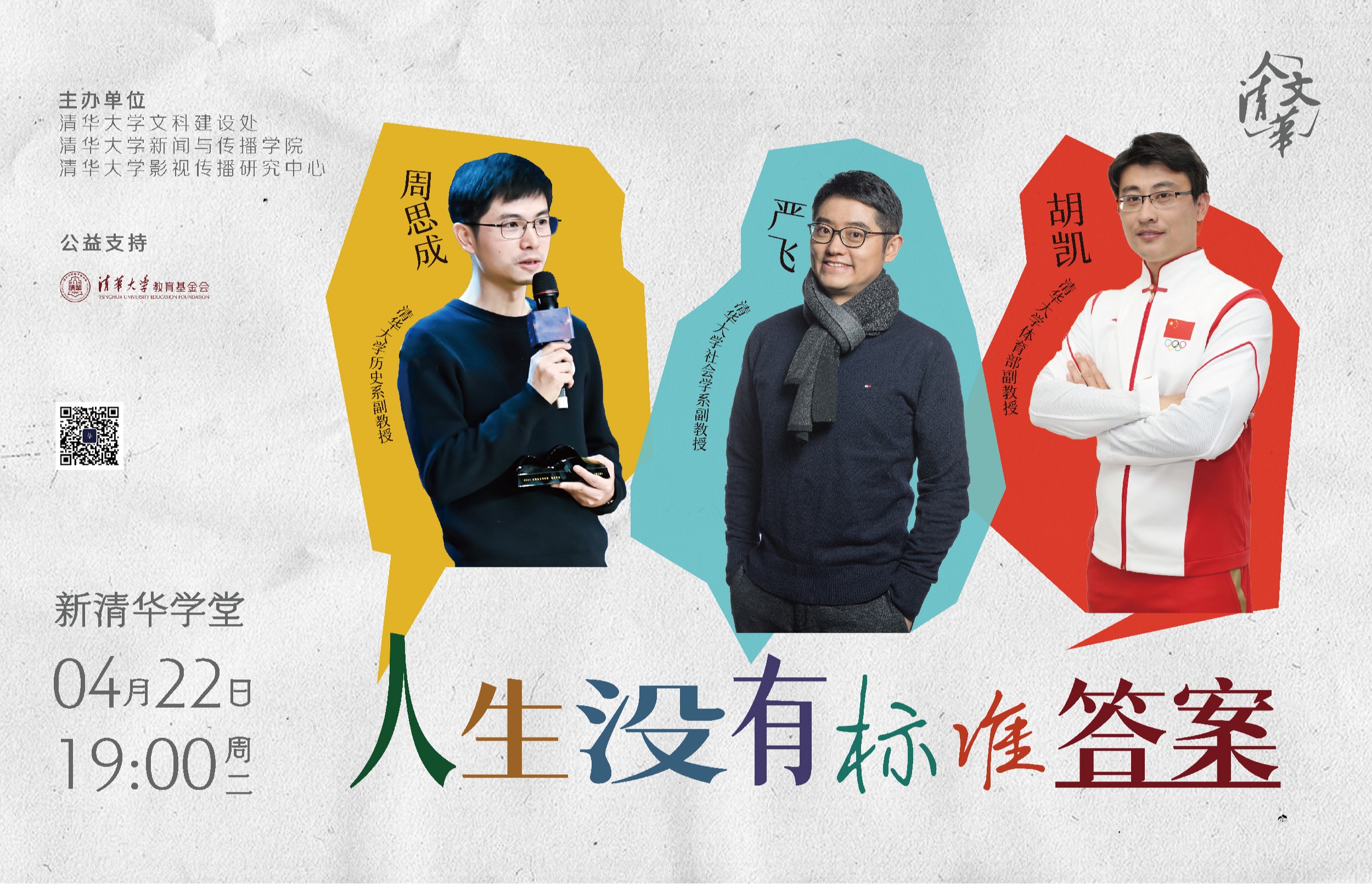 4月22日晚7点,“人文清华”讲坛校庆特别节目,青年学者专场第二季,3位清华80后学者,社会学学者严飞、历史学学者周思成、中国首个百米世界冠军胡凯联袂推出“人生没有标准答案”,带来他们在各自领域的观察、思考和体悟。